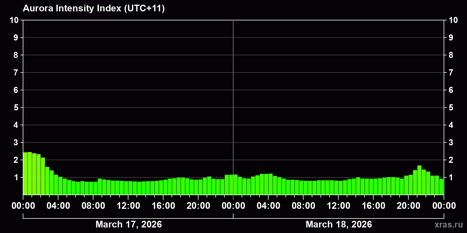 Changes in the auroral intensity index from 2026-03-17 to 2026-03-18 local time