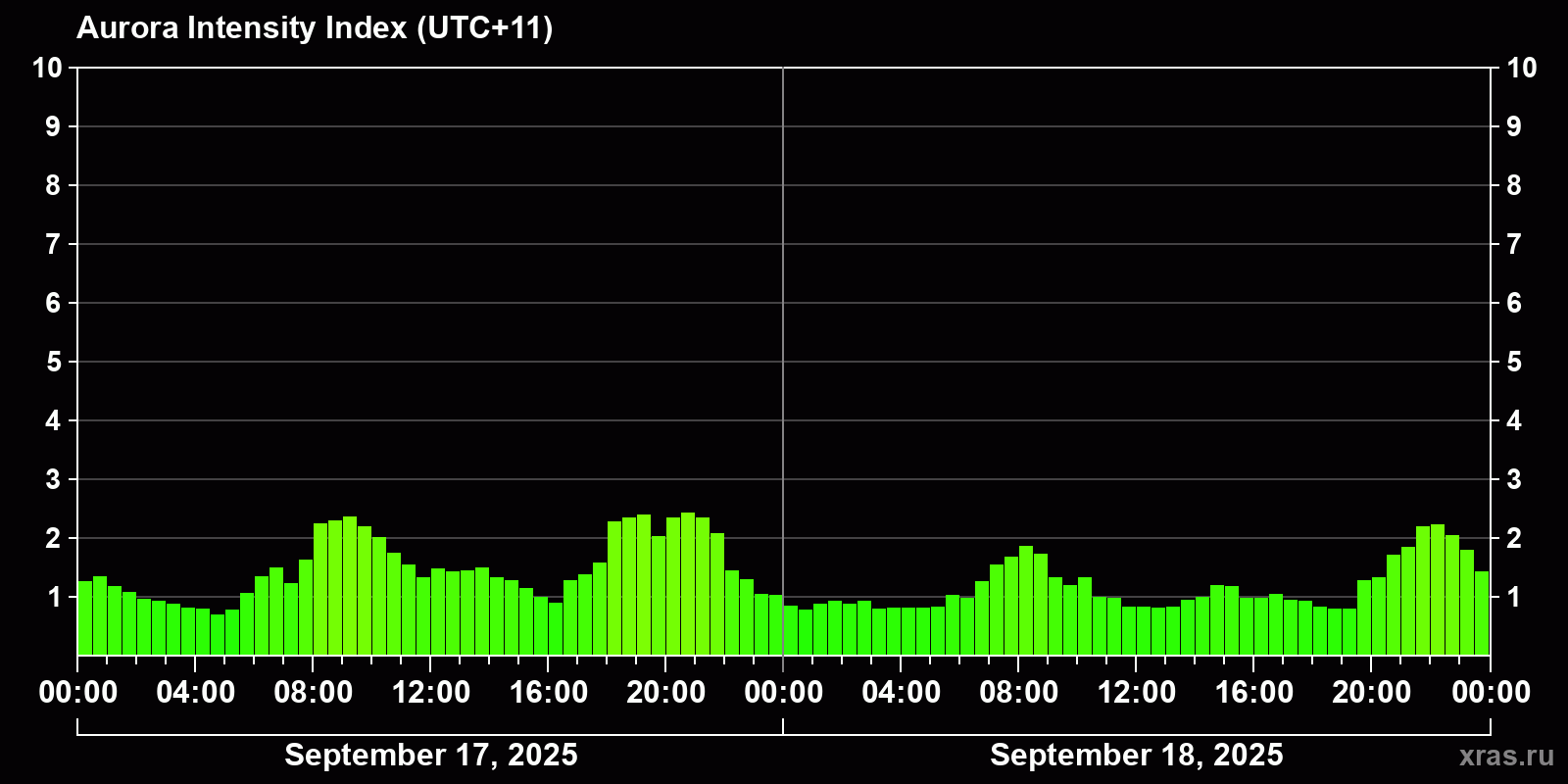 Changes in the auroral intensity index from 2025-09-17 to 2025-09-18 local time