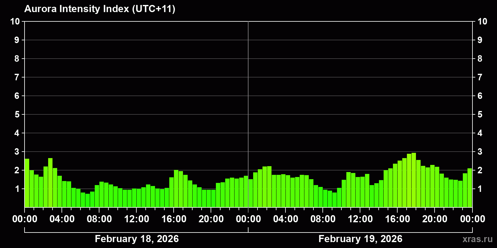 Changes in the auroral intensity index from 2026-02-18 to 2026-02-19 local time