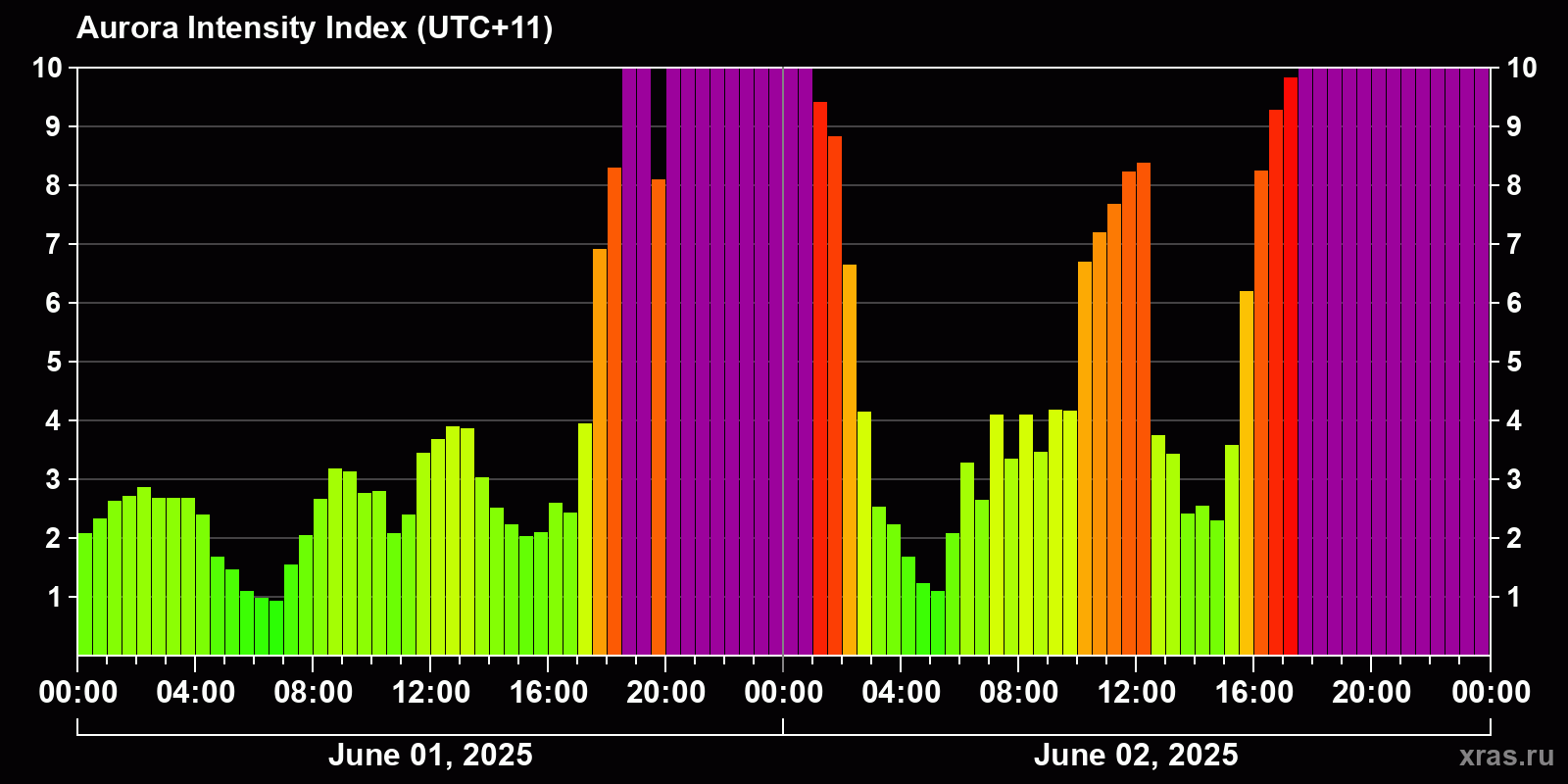 Changes in the auroral intensity index from 2025-06-01 to 2025-06-02 local time
