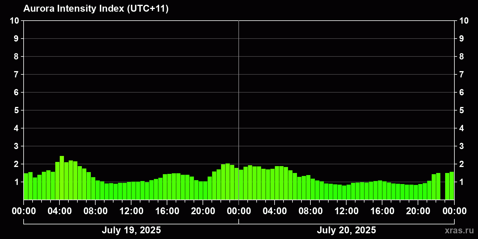 Changes in the auroral intensity index from 2025-07-19 to 2025-07-20 local time