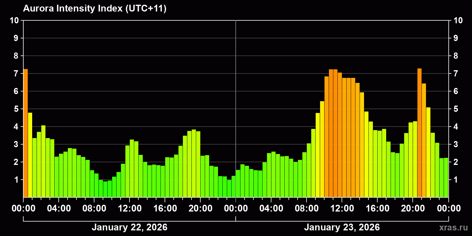 Changes in the auroral intensity index from 2026-01-22 to 2026-01-23 local time
