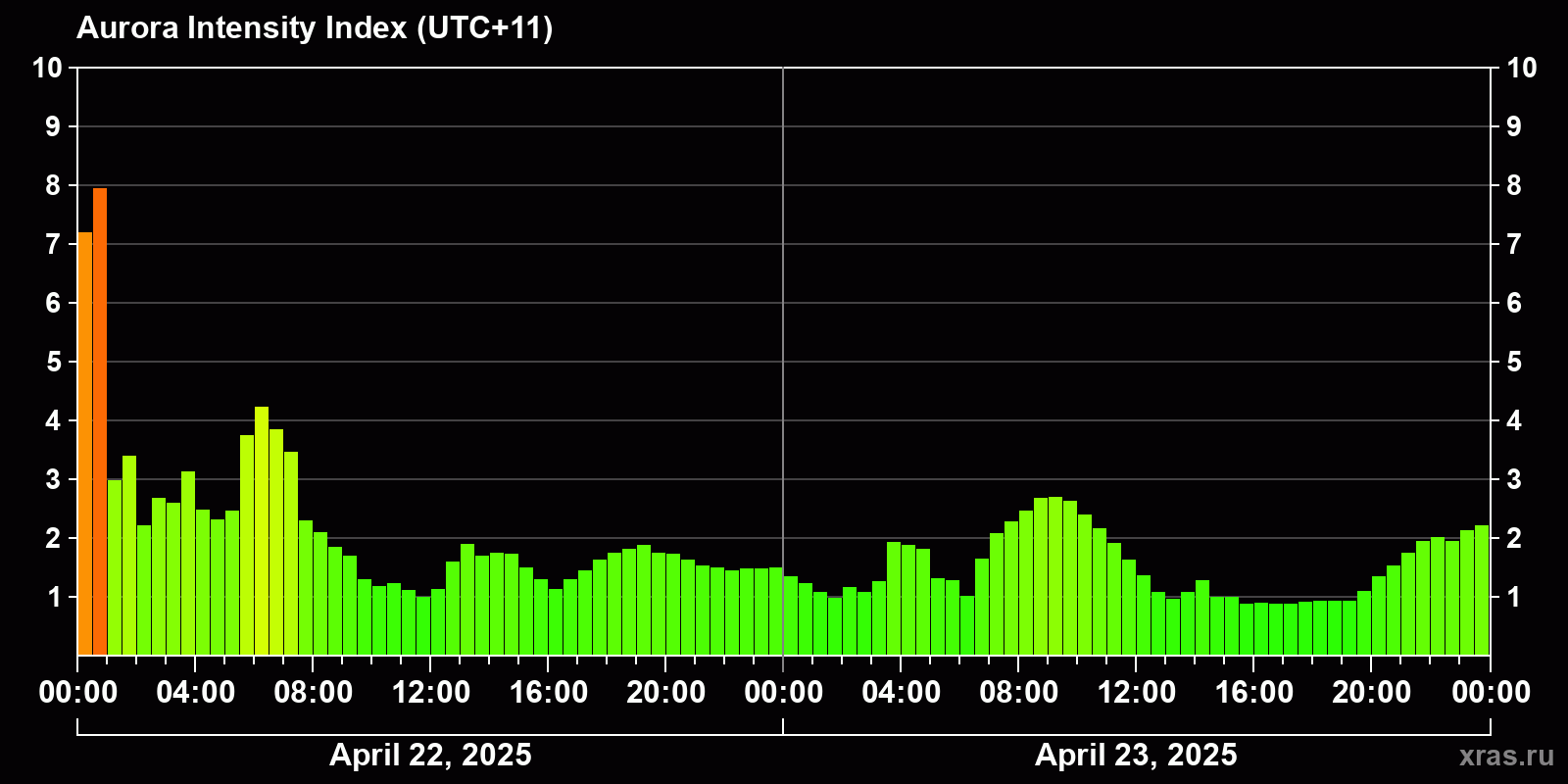 Changes in the auroral intensity index from 2025-04-22 to 2025-04-23 local time