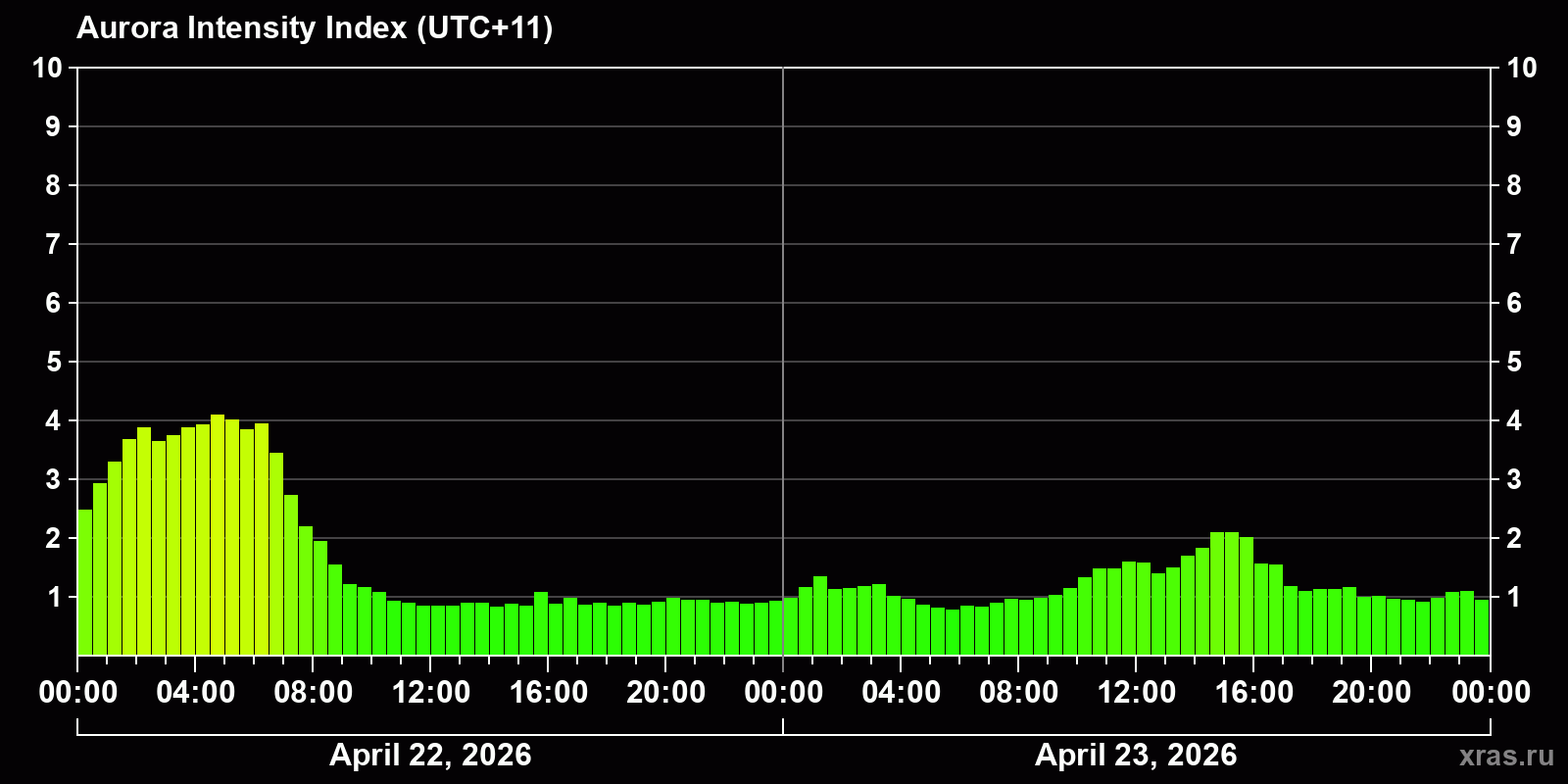 Auroral intensity index and the theoretically possible latitude of observations for nighttime in the Estern Hemisphere as of 2026-04-23 23:56 (end of day) local time