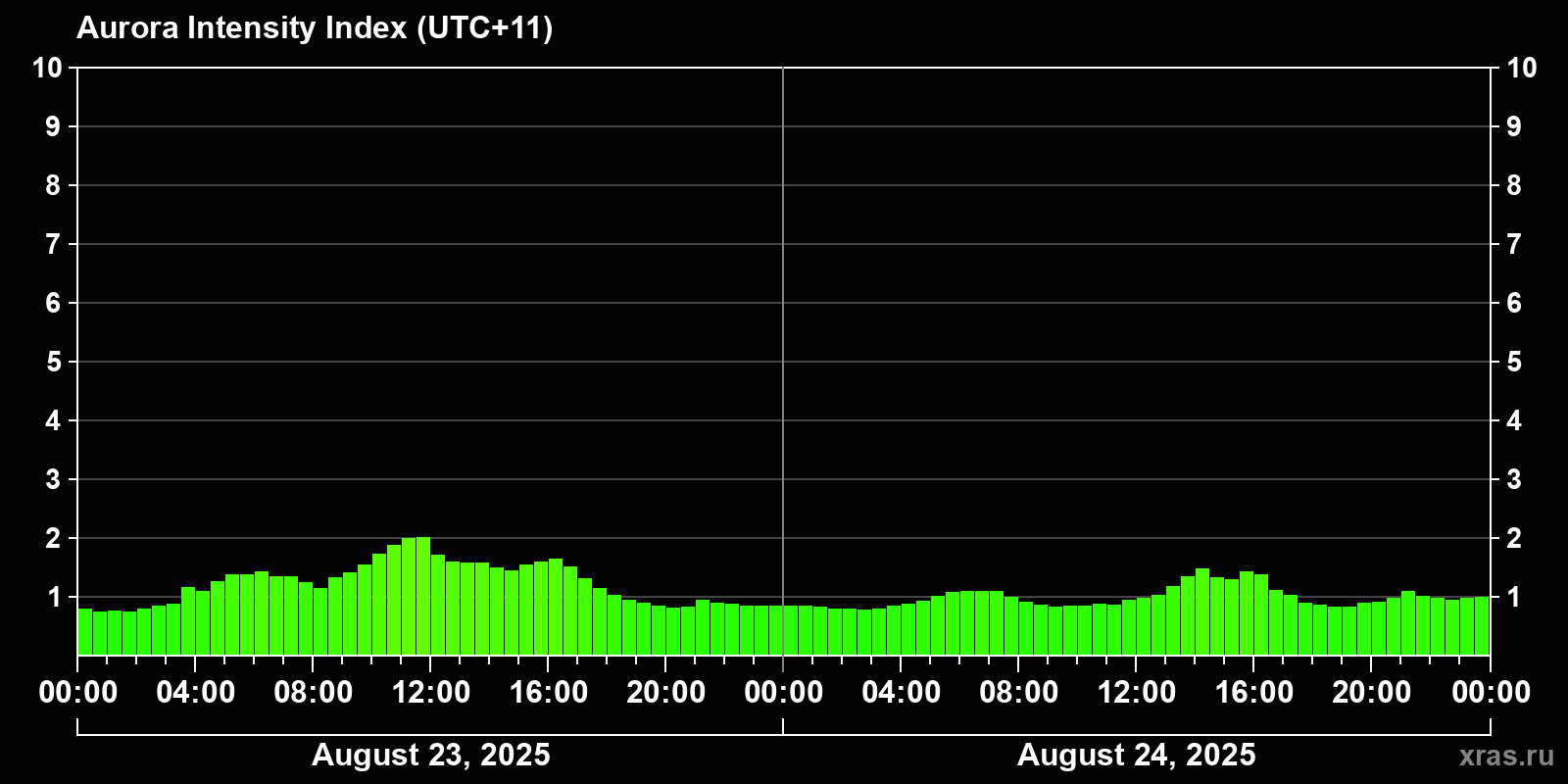 Auroral intensity index and the theoretically possible latitude of observations for nighttime in the Estern Hemisphere as of 2025-08-24 23:55 (end of day) local time