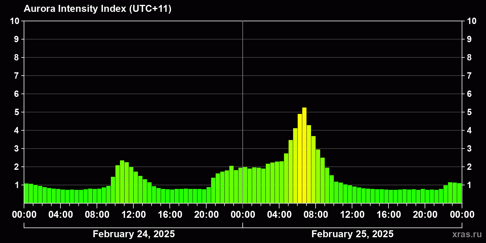 Changes in the auroral intensity index from 2025-02-24 to 2025-02-25 local time