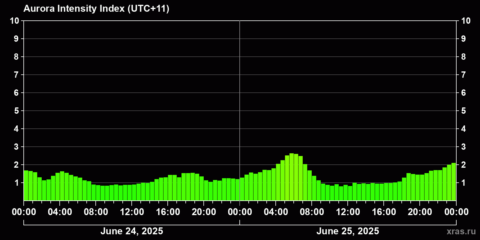 Changes in the auroral intensity index from 2025-06-24 to 2025-06-25 local time