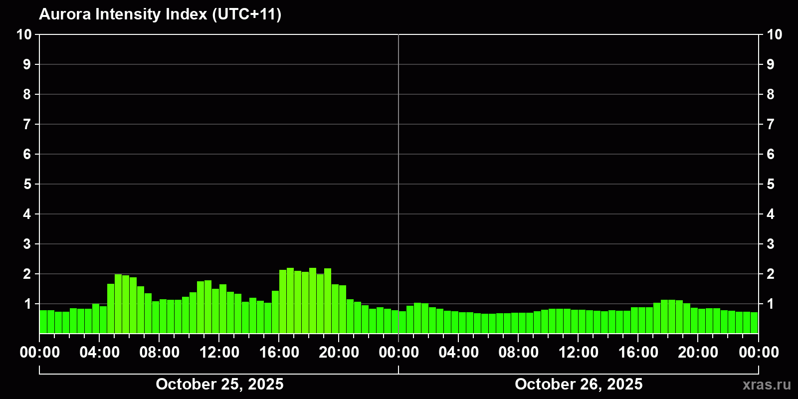 Changes in the auroral intensity index from 2025-10-25 to 2025-10-26 local time