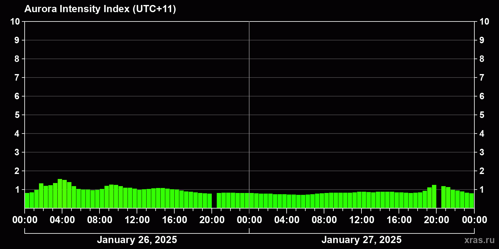 Changes in the auroral intensity index from 2025-01-26 to 2025-01-27 local time
