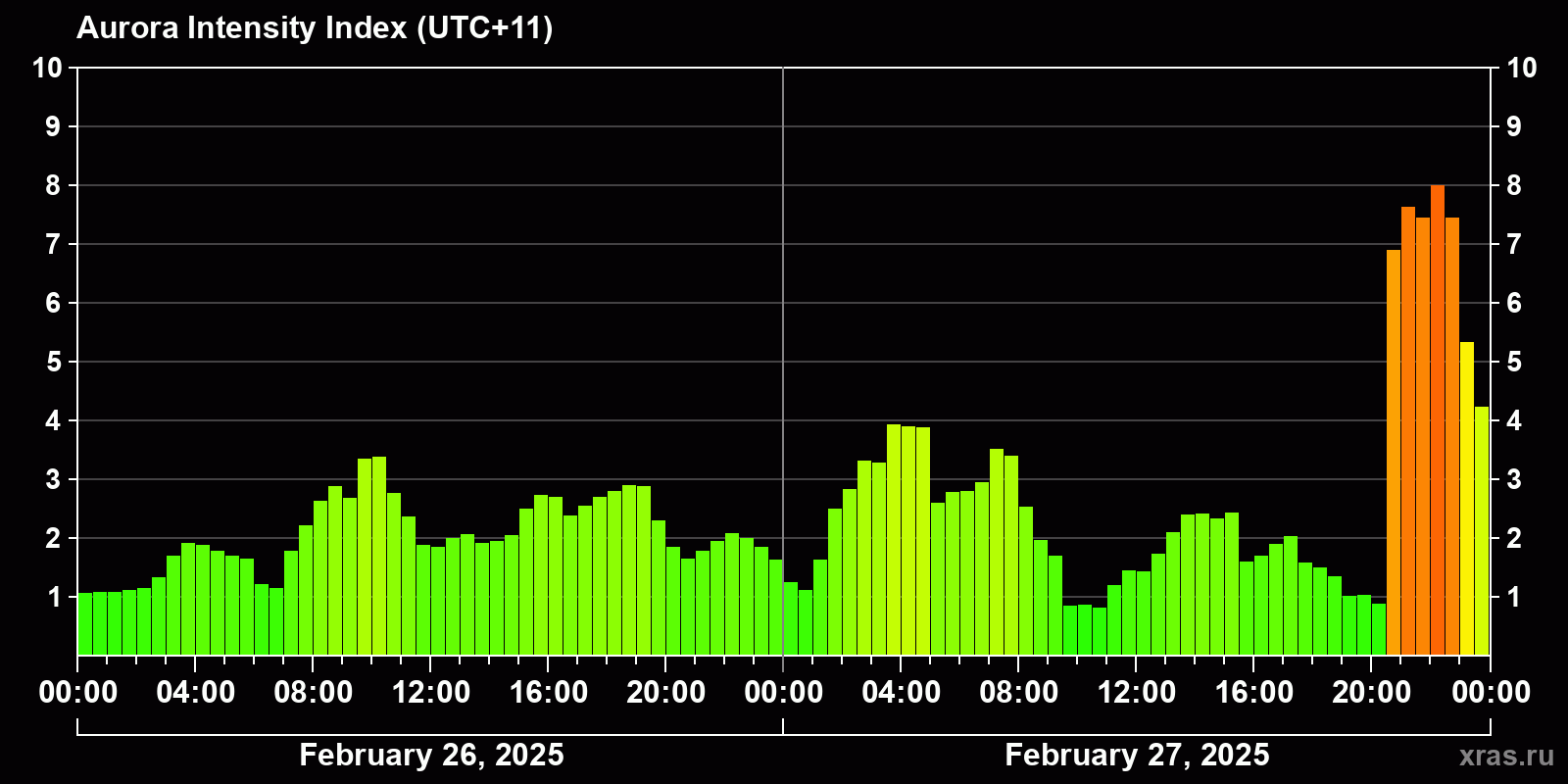 Changes in the auroral intensity index from 2025-02-26 to 2025-02-27 local time