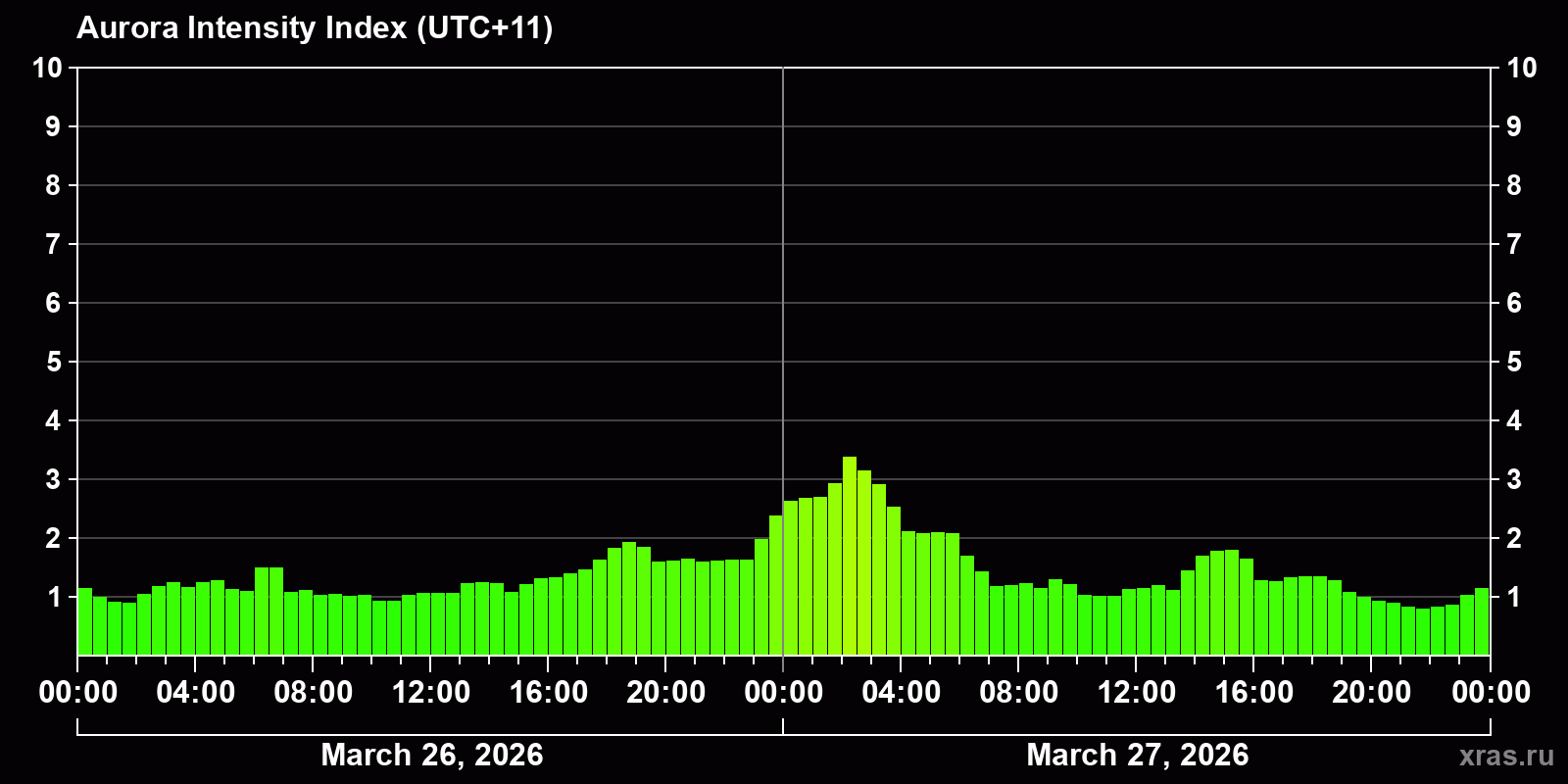 Changes in the auroral intensity index from 2026-03-26 to 2026-03-27 local time