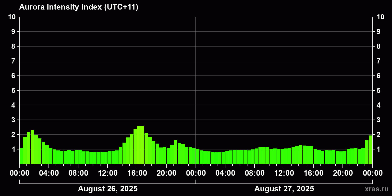 Changes in the auroral intensity index from 2025-08-26 to 2025-08-27 local time
