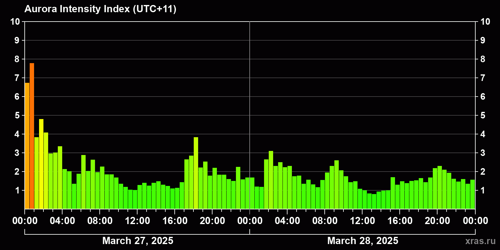 Changes in the auroral intensity index from 2025-03-27 to 2025-03-28 local time