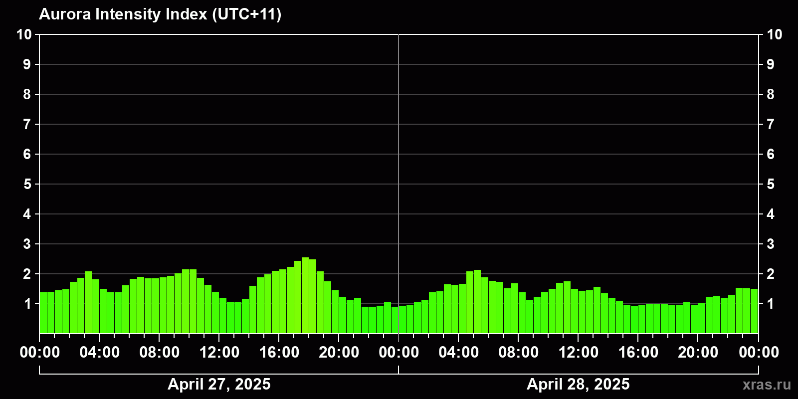 Changes in the auroral intensity index from 2025-04-27 to 2025-04-28 local time