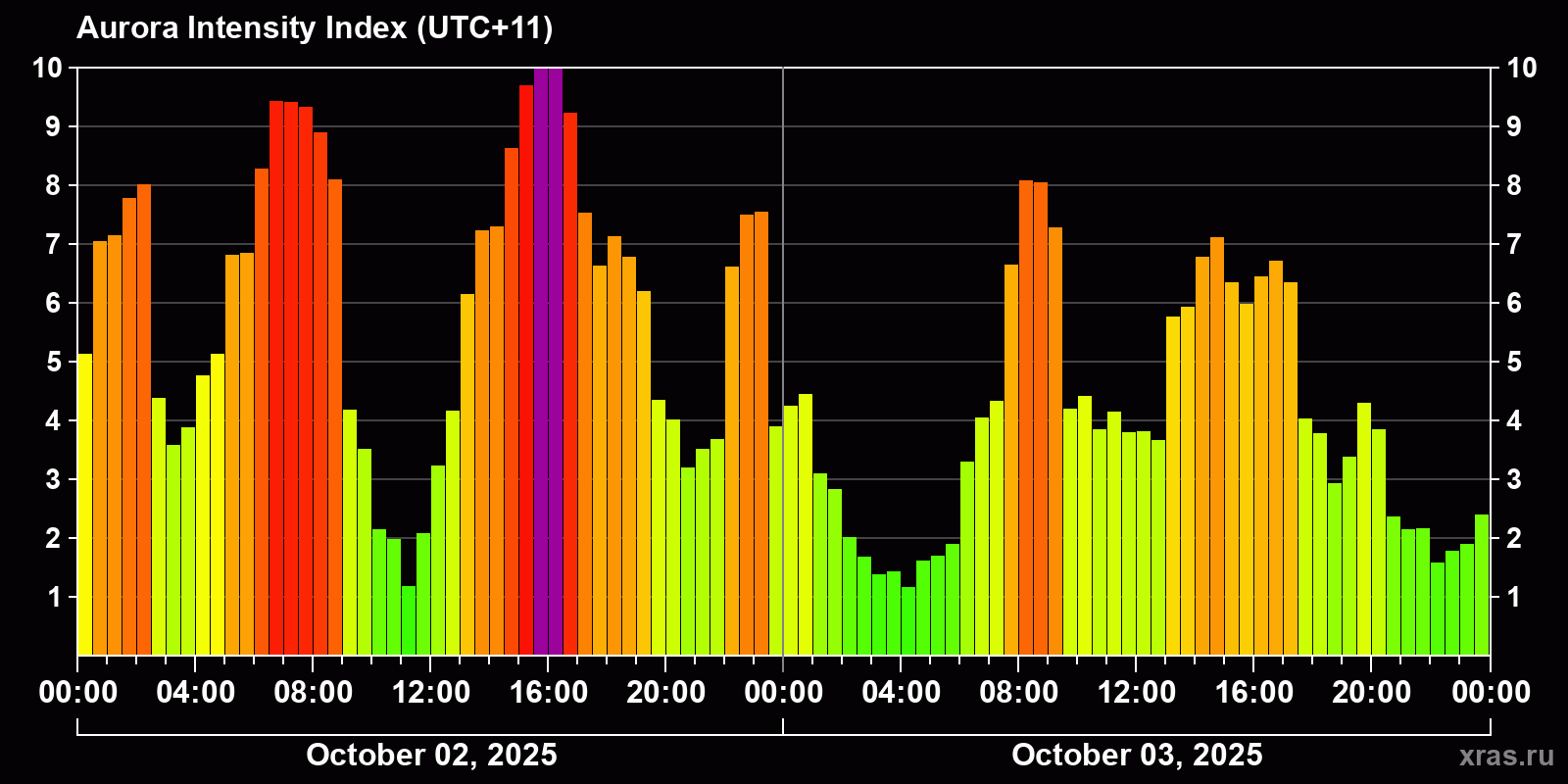 Changes in the auroral intensity index from 2025-10-02 to 2025-10-03 local time