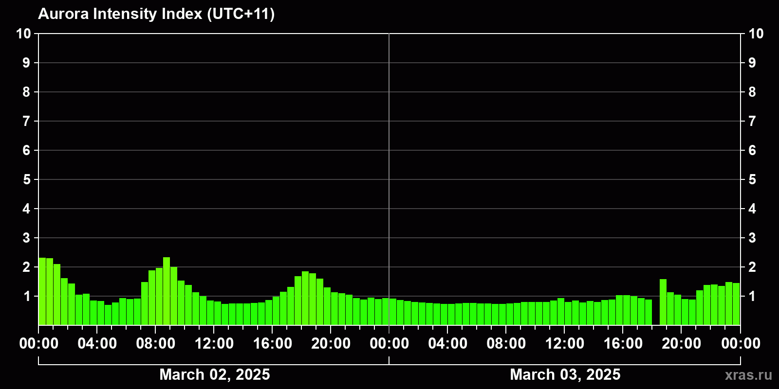 Changes in the auroral intensity index from 2025-03-02 to 2025-03-03 local time