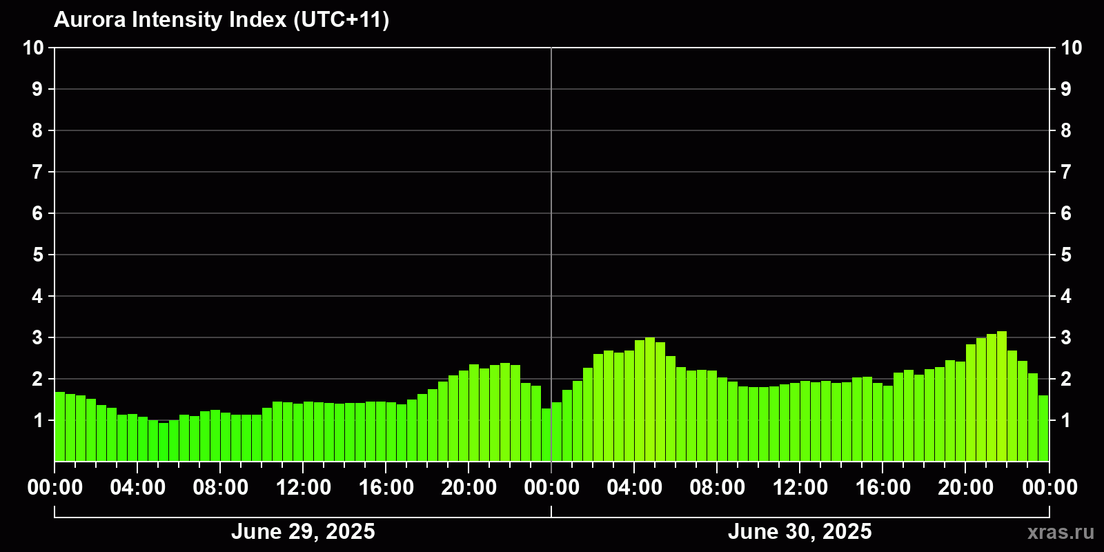 Changes in the auroral intensity index from 2025-06-29 to 2025-06-30 local time