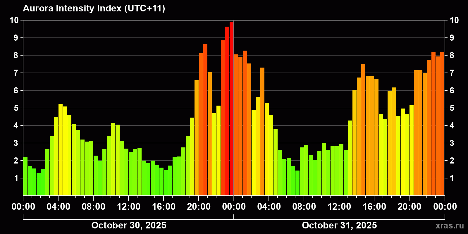 Changes in the auroral intensity index from 2025-10-30 to 2025-10-31 local time