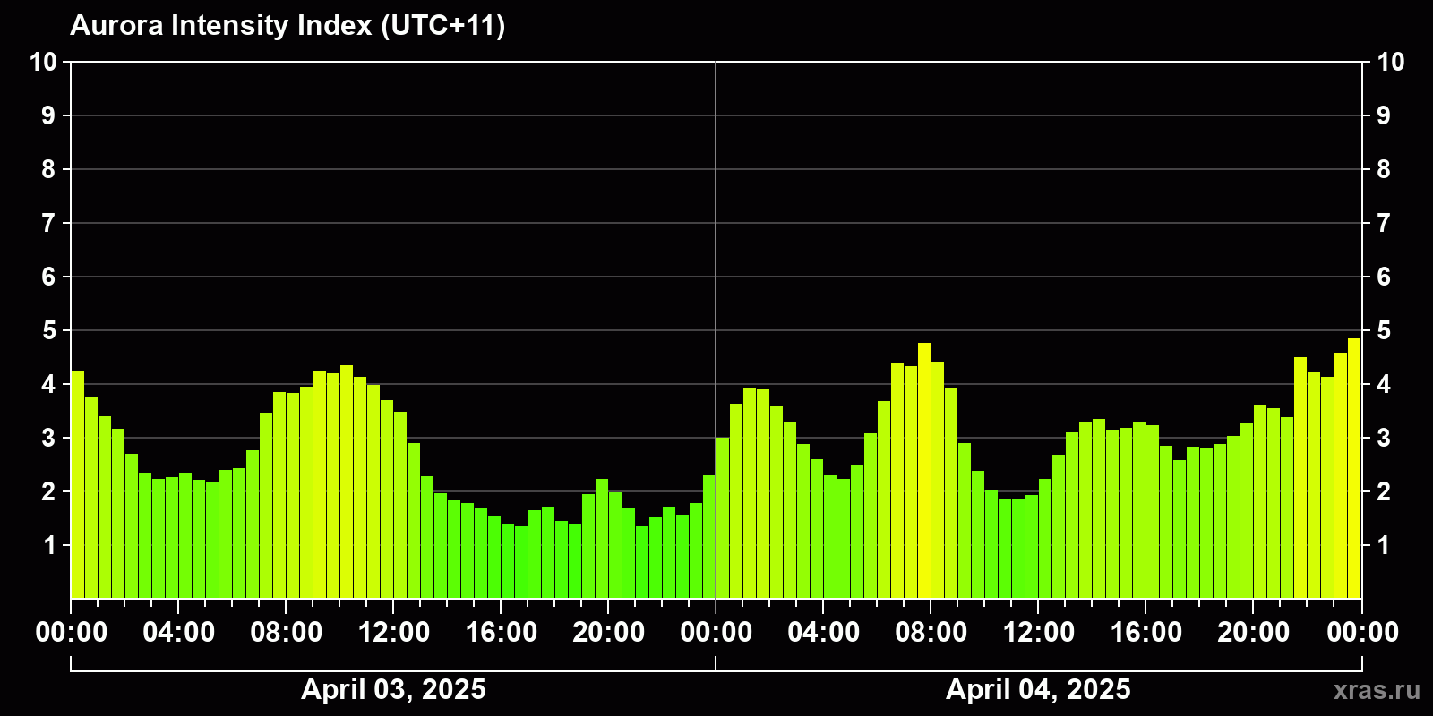 Changes in the auroral intensity index from 2025-04-03 to 2025-04-04 local time