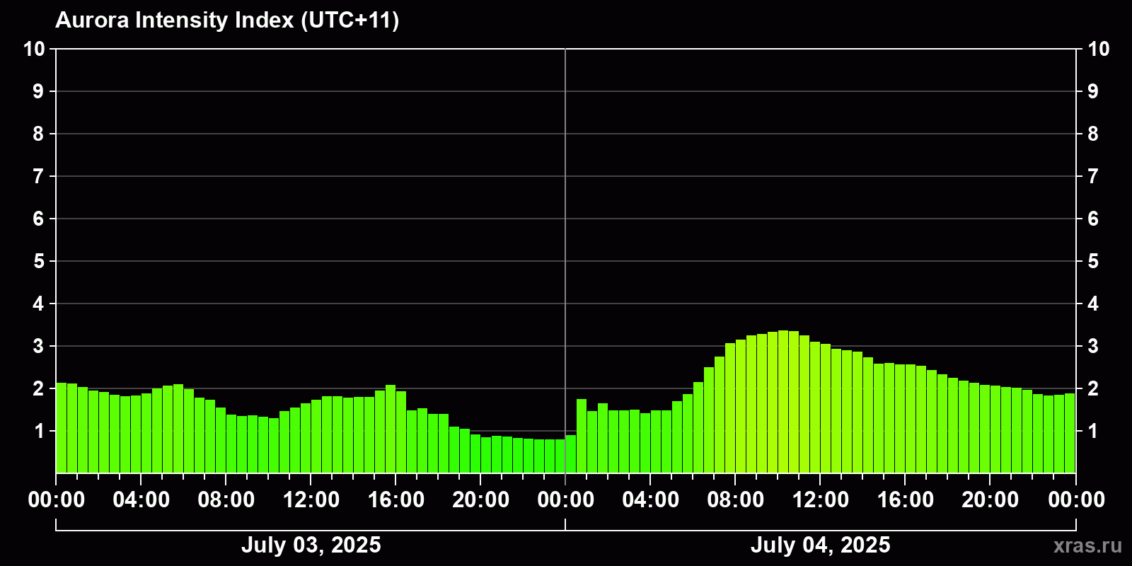 Changes in the auroral intensity index from 2025-07-03 to 2025-07-04 local time