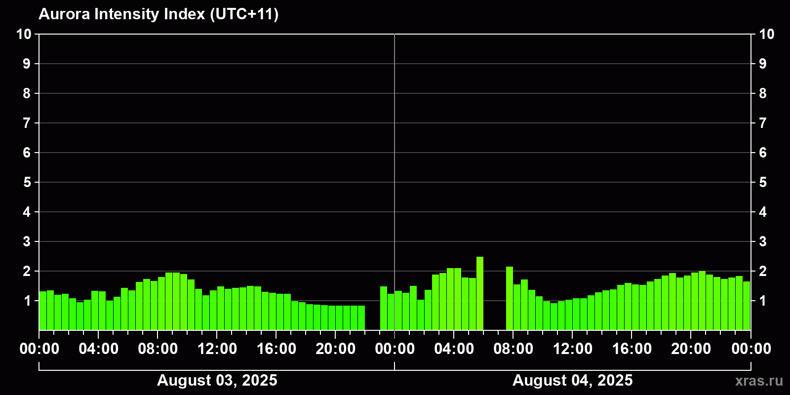 Changes in the auroral intensity index from 2025-08-03 to 2025-08-04 local time