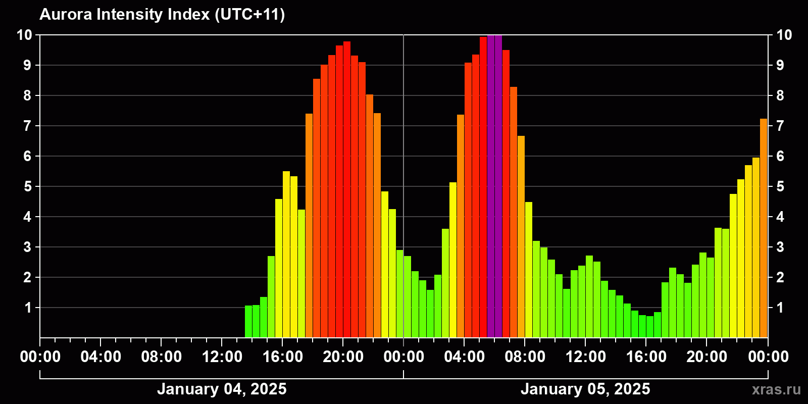 Changes in the auroral intensity index from 2025-01-04 to 2025-01-05 local time