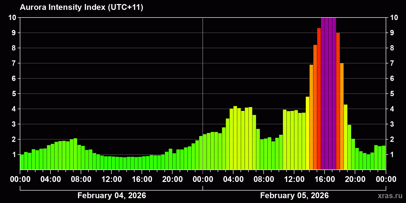 Changes in the auroral intensity index from 2026-02-04 to 2026-02-05 local time