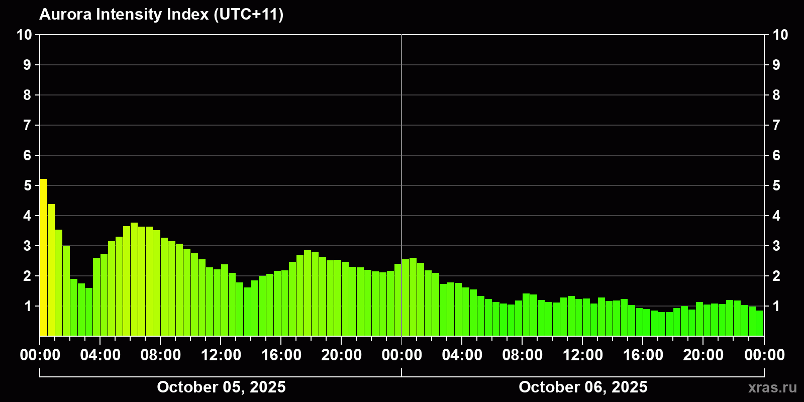 Changes in the auroral intensity index from 2025-10-05 to 2025-10-06 local time