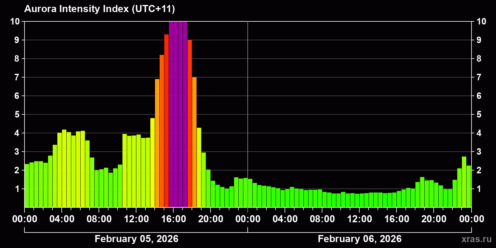Auroral intensity index and the theoretically possible latitude of observations for nighttime in the Estern Hemisphere as of 2026-02-06 23:54 (end of day) local time