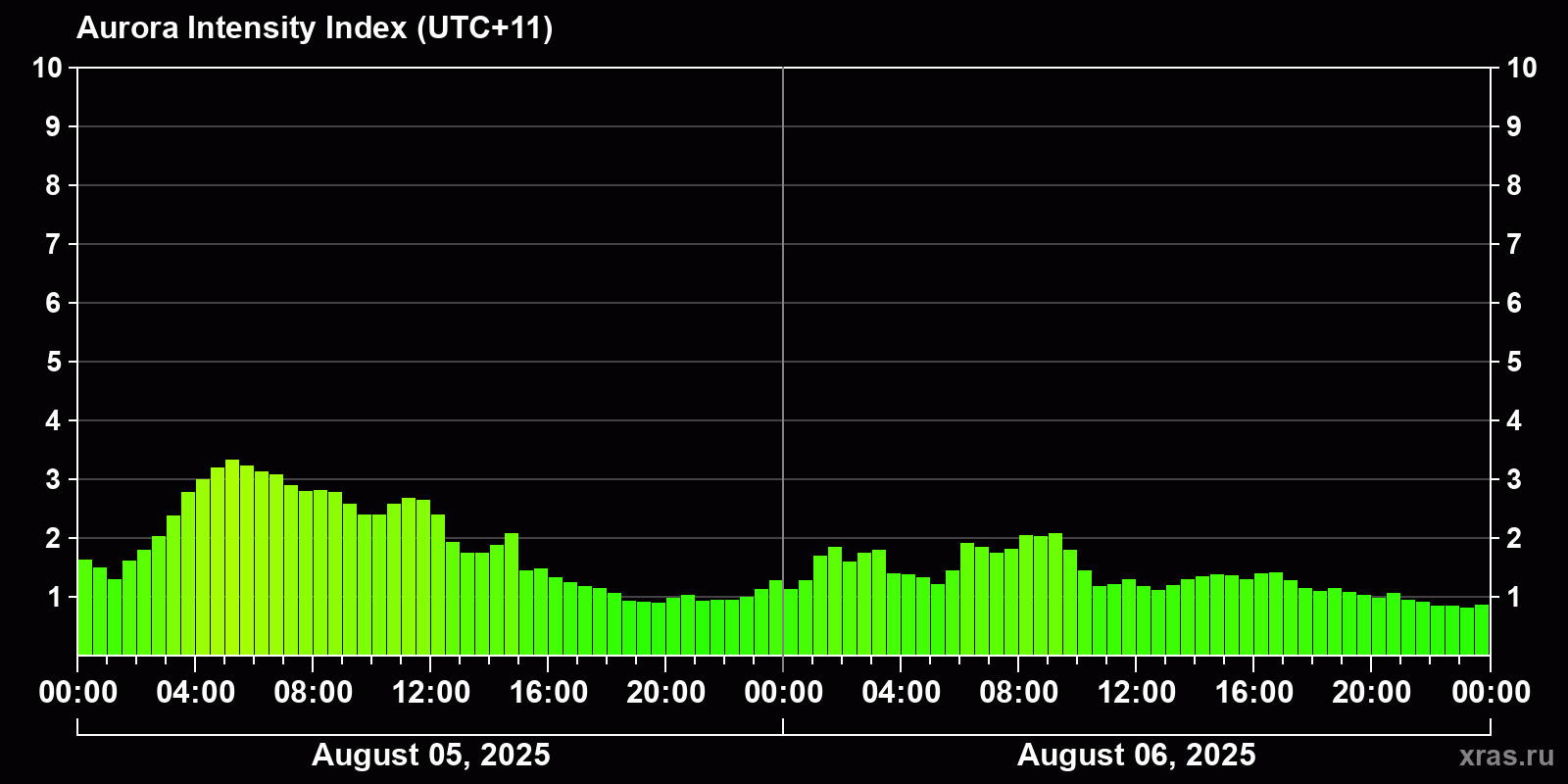 Changes in the auroral intensity index from 2025-08-05 to 2025-08-06 local time