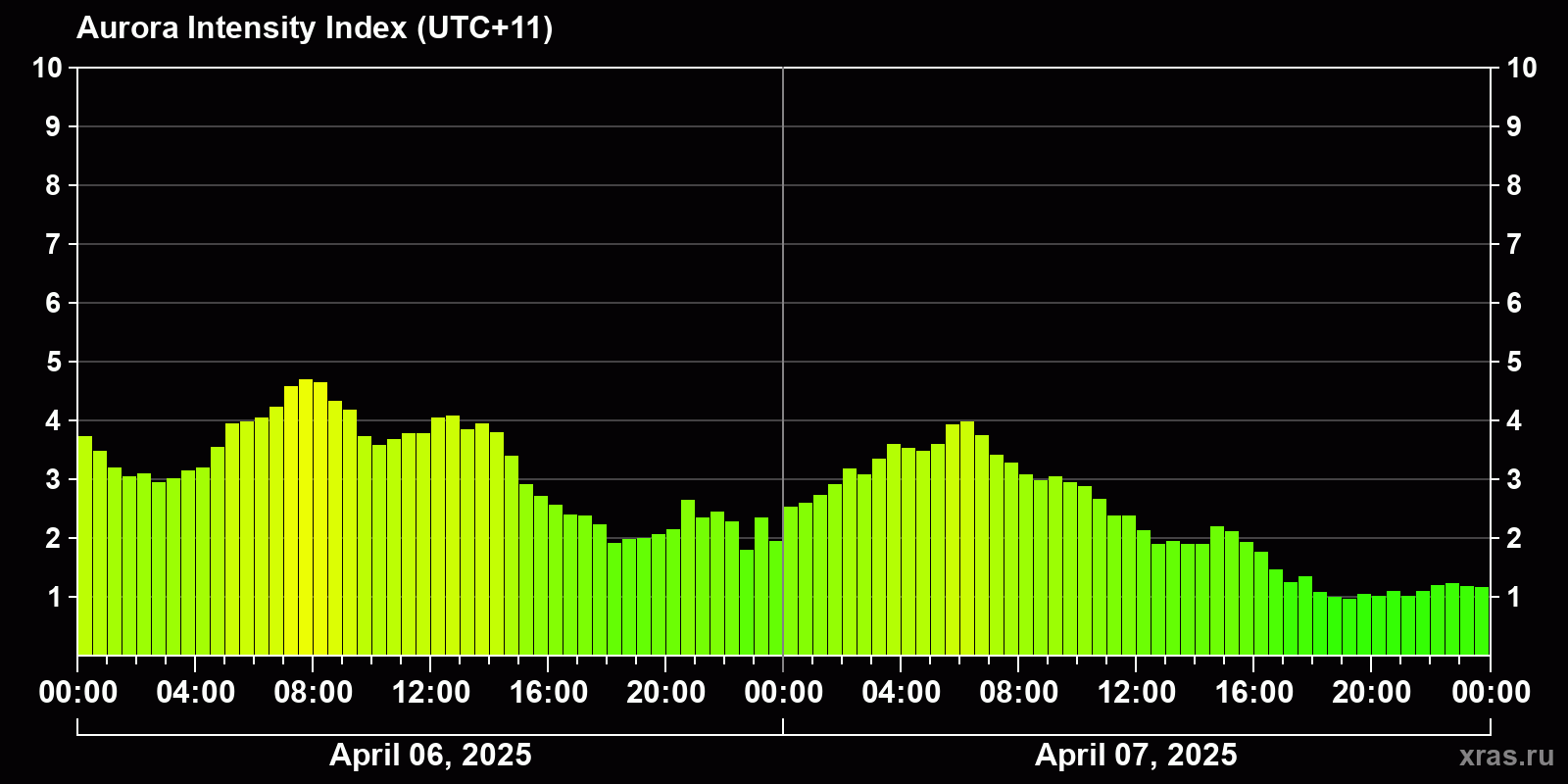 Auroral intensity index and the theoretically possible latitude of observations for nighttime in the Estern Hemisphere as of 2025-04-07 23:53 (end of day) local time