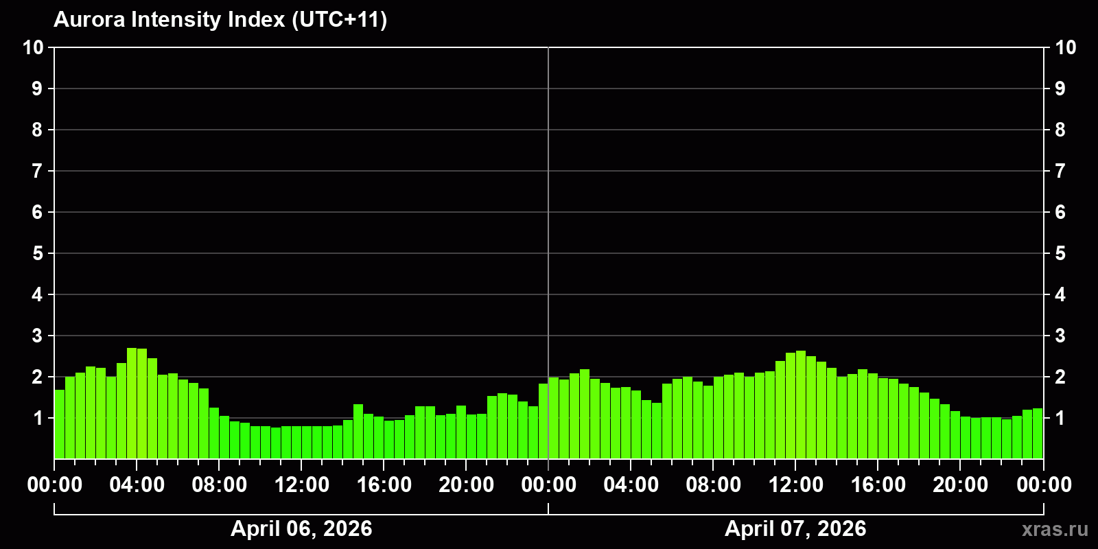 Changes in the auroral intensity index from 2026-04-06 to 2026-04-07 local time