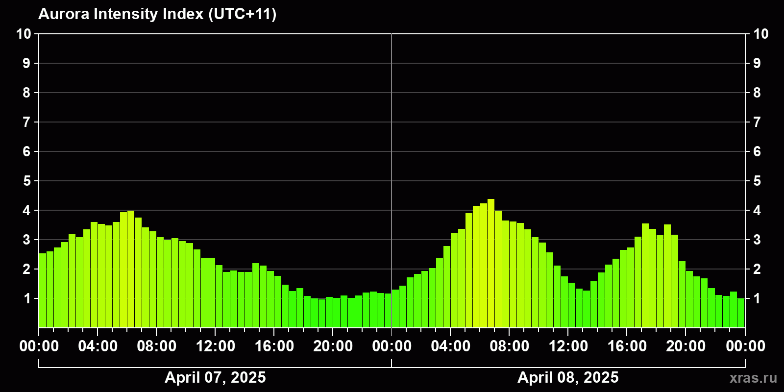 Auroral intensity index and the theoretically possible latitude of observations for nighttime in the Estern Hemisphere as of 2025-04-08 23:54 (end of day) local time