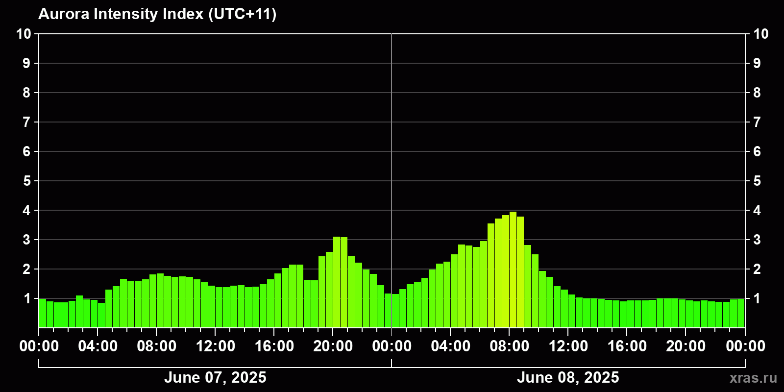 Changes in the auroral intensity index from 2025-06-07 to 2025-06-08 local time