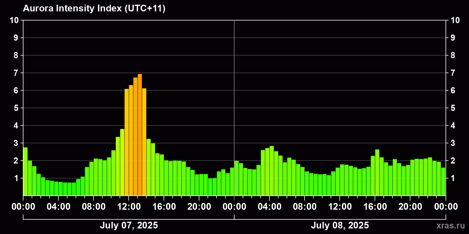 Changes in the auroral intensity index from 2025-07-07 to 2025-07-08 local time