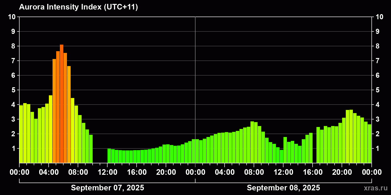Auroral intensity index and the theoretically possible latitude of observations for nighttime in the Estern Hemisphere as of 2025-09-08 23:44 (end of day) local time