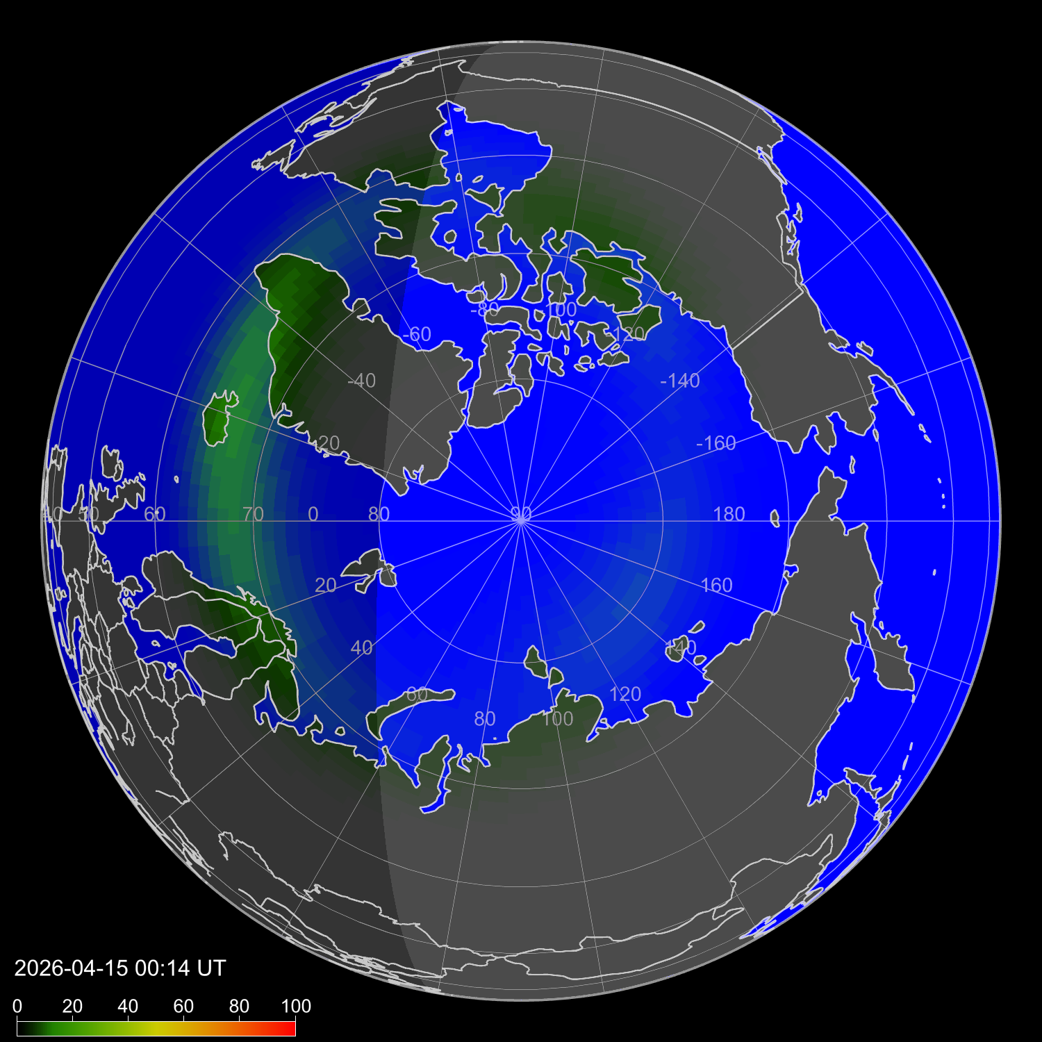 Auroral intensity index and theoretically possible latitude of observations for nighttime in the Estern Hemisphere