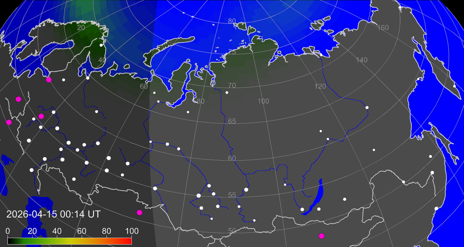 Probability of northern lights (auroras) in cities of Russia