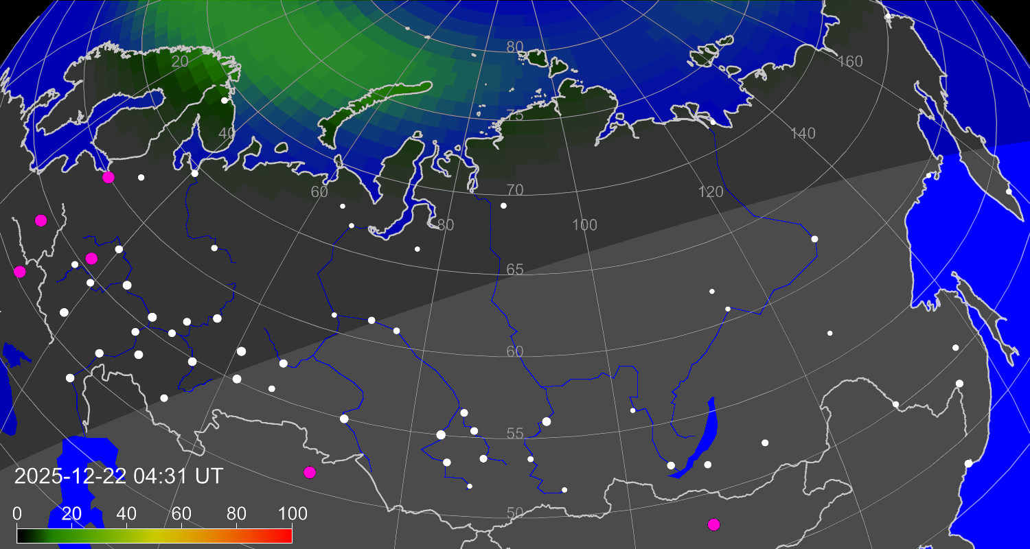 Индекс интенсивности полярных сияний и теоретически возможная широта наблюдений для ночного времени в восточном полушарии