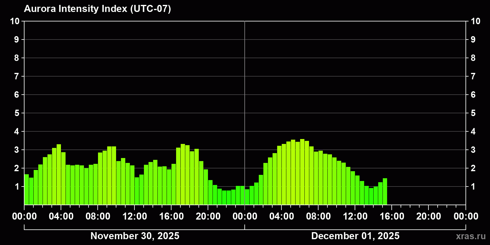 Changes in the auroral intensity index from 2025-11-30 to 2025-12-01 local time