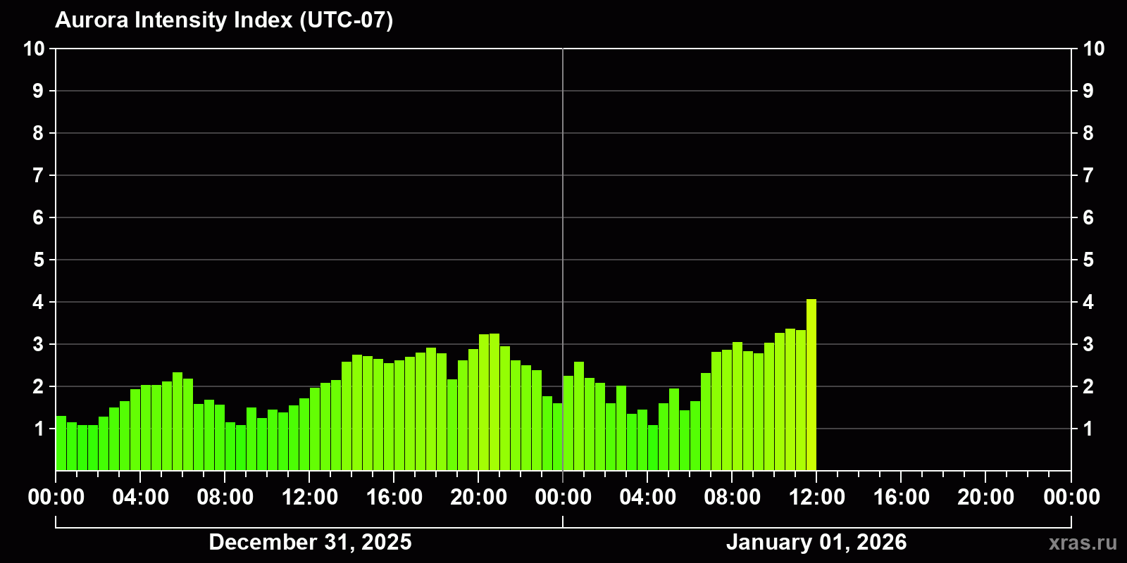 Auroral intensity index and the theoretically possible latitude of observations for nighttime in the Western Hemisphere as of 2026-01-01 09:51 (end of day) local time