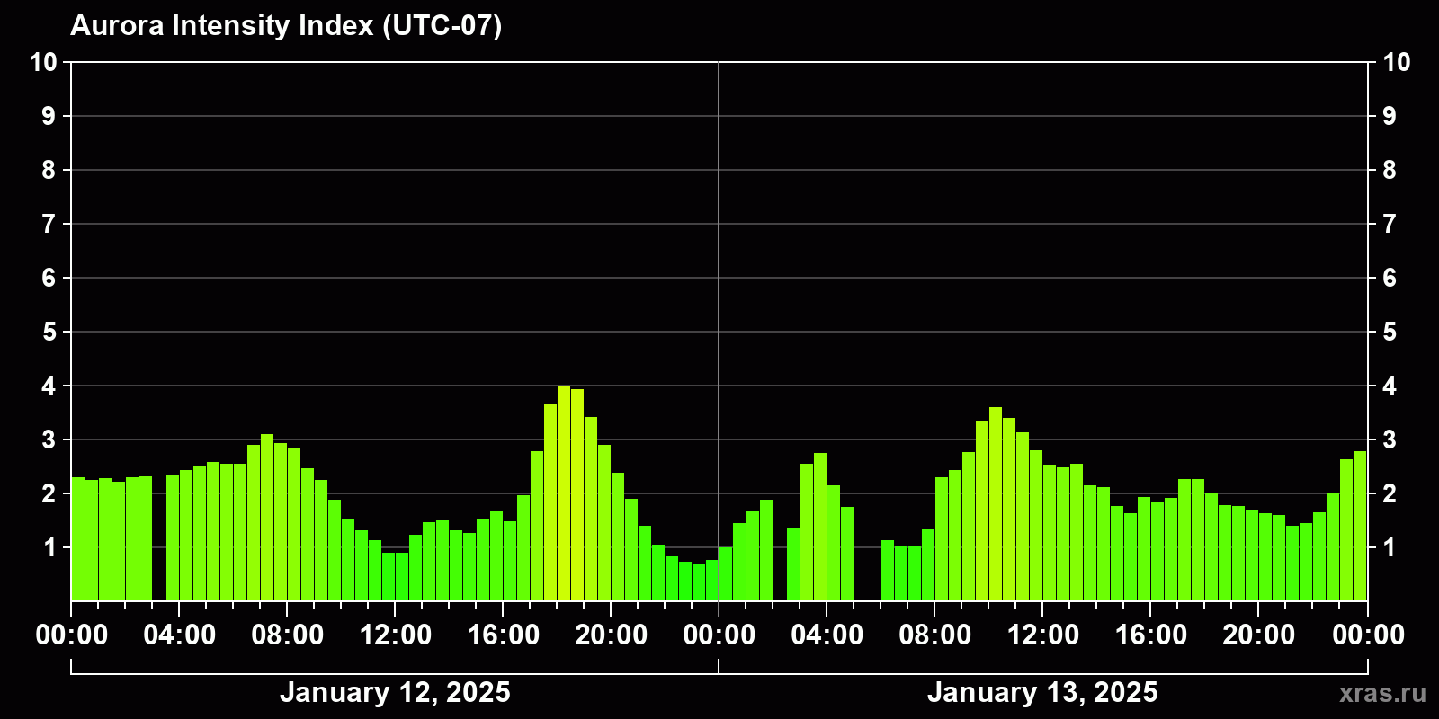 Auroral intensity index and the theoretically possible latitude of observations for nighttime in the Western Hemisphere as of 2025-01-13 23:54 (end of day) local time