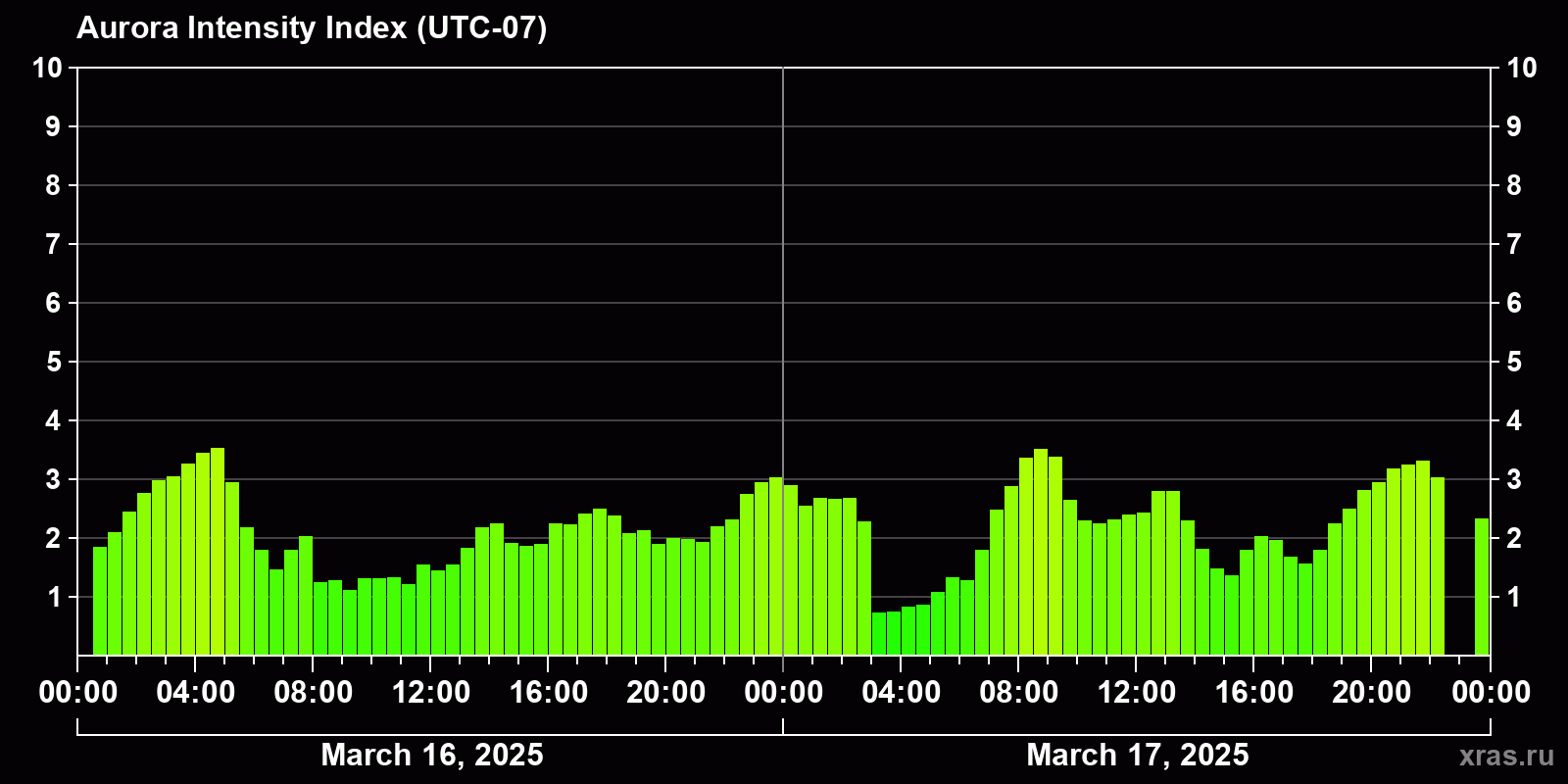 Auroral intensity index and the theoretically possible latitude of observations for nighttime in the Western Hemisphere as of 2025-03-17 23:52 (end of day) local time