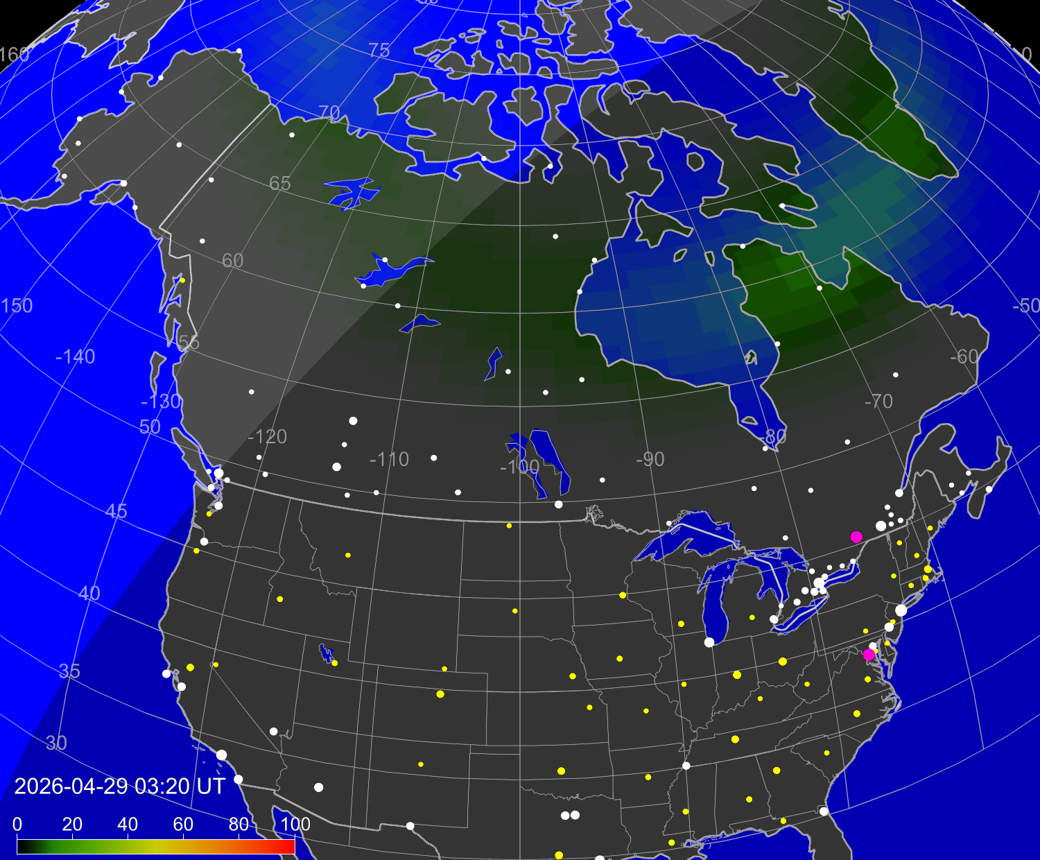 Auroral intensity index and theoretically possible latitude of observations for nighttime in the Western Hemisphere