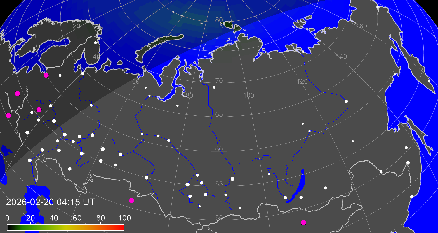 Изменения и часовой прогноз индекса интенсивности полярных сияний с 2026-02-19 по 2026-02-20