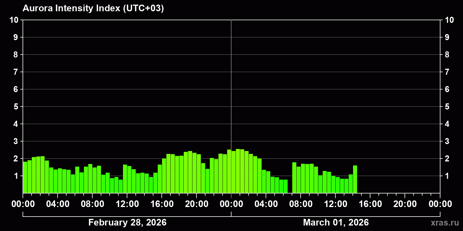 Changes in the auroral intensity index from 2026-02-28 to 2026-03-01 local time