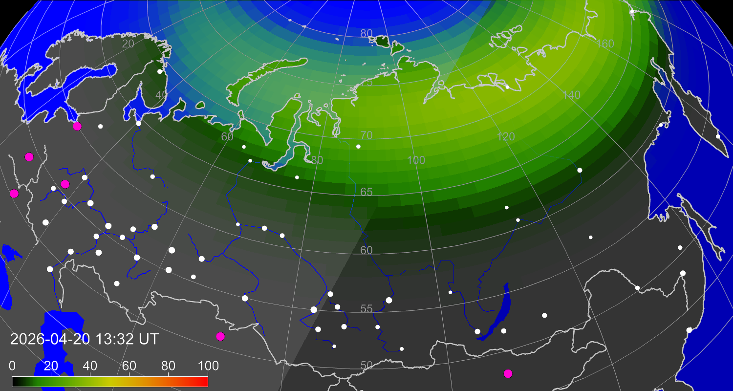 Auroral intensity index and theoretically possible latitude of observations for nighttime in the Estern Hemisphere