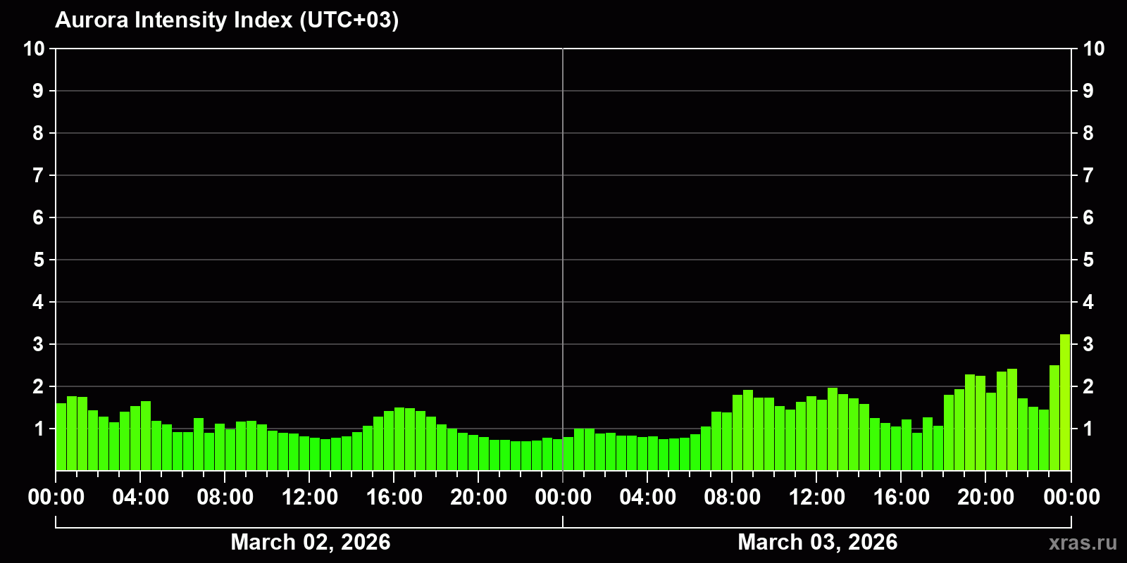 Changes in the auroral intensity index from 2026-03-02 to 2026-03-03 local time