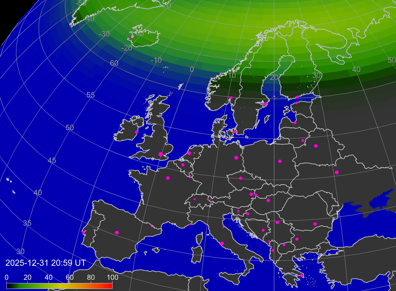 Индекс интенсивности полярных сияний и теоретически возможная широта наблюдений для ночного времени в восточном полушарии