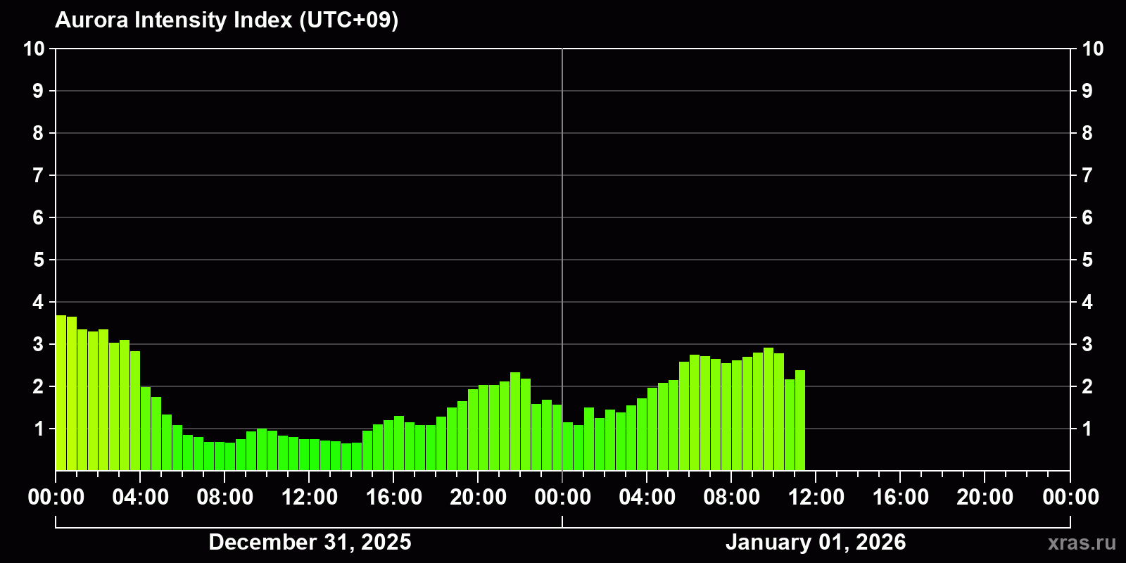 Auroral intensity index and the theoretically possible latitude of observations for nighttime in the Estern Hemisphere as of 2026-01-01 07:40 (end of day) local time
